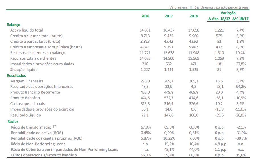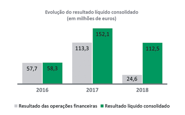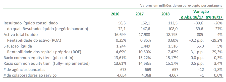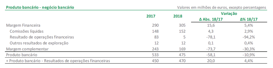 No negócio bancário, o resultado líquido foi positivo em 108,0 milhões de euros em 2018, o que compara com o resultado de 2017 que se cifrou nos 147,6 milhões de euros. Em 2018, os resultados de operações financeiras contribuíram com 4,8 milhões de euros para o resultado líquido consolidado de 108,0 milhões de euros.