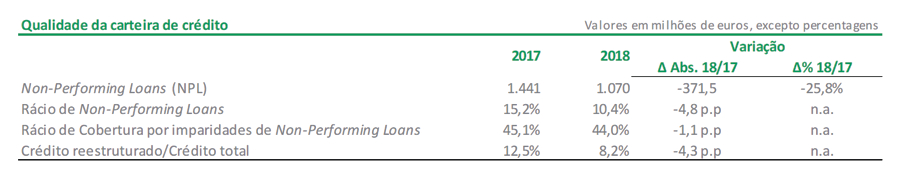O rácio de NPL situou-se nos 10,4% em 2018, tendo registado uma evolução favorável face aos 15,2% de 2017. Relativamente à cobertura de NPL por provisões e imparidades, o Crédito Agrícola manteve em 2018 um rácio de 44,0%.