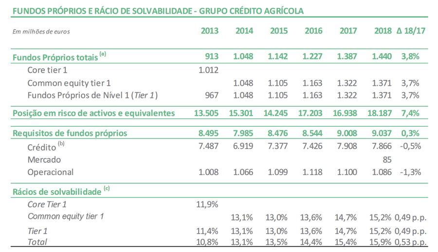 Os rácios common equity tier 1 (CET1) e solvabilidade total, calculados para 2018 com a aplicação integral das regras previstas no Regulamento (UE) n.º 575/2013 (CRD IV), apresentam respectivamente os valores de 15,2% e 15,9%.