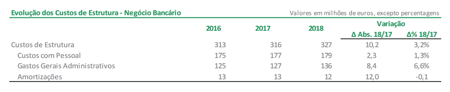 O produto bancário beneficiou do crescimento verificado nas comissões líquidas que, em 2018, se fixaram em 152 milhões de euros, traduzindo um crescimento de 4,3 milhões de euros (+2,9%) face ao observado em 2017. A variação negativa de 58,1 milhões de euros verificada no produto bancário, é justificada pelos resultados obtidos em operações financeiras, que se reduziram em 78,1 milhões de euros face a 2017 (-94,2%). Verificou-se um crescimento nos custos de estrutura para os 327 milhões de euros, tendo estes aumentado cerca de 10,2 milhões de euros em termos homólogos (+3,2%). Esta evolução é explicada pelo aumento de 8,4 milhões de euros dos gastos gerais administrativos e de 2,3 milhões de euros nos custos com pessoal. O agravamento dos custos de estrutura resultou, em grande medida, do aumento dos custos relacionados com a aposta tecnológica e de capacitação do Grupo CA no sentido de rejuvenescer a base de clientes, modernizar a oferta, reduzir os custos de operação, e acompanhar as tendências do mercado, sem descurar o cumprimento das exigências regulamentares.