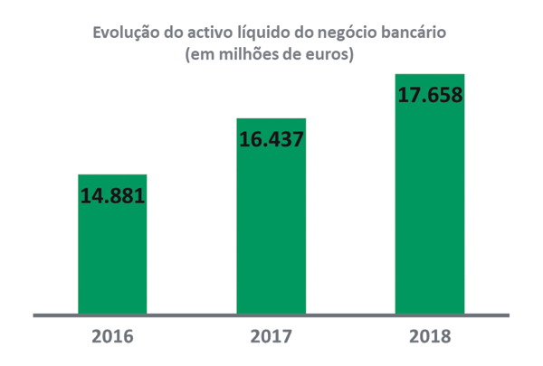 Relativamente ao balanço do negócio bancário do Crédito Agrícola, registou-se um acréscimo de 7,4% no activo total que passou de 16.437 milhões de euros em 2017 para 17.658 milhões de euros em 2018.