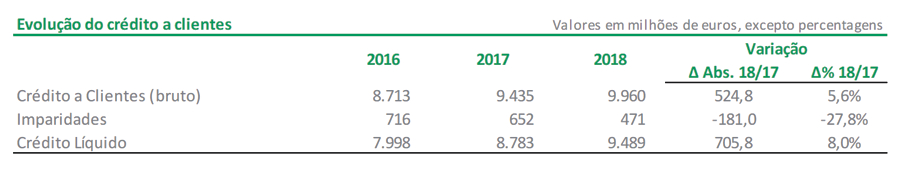 O crédito a clientes, em termos brutos, registou um crescimento face a 2017 de 5,6%, tendo o crédito líquido aumentado 8,0% no mesmo período.