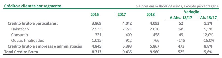 No que respeita à segmentação do crédito a clientes, o crédito a particulares fixou-se nos 4.093 milhões de euros, o que representa um aumento de 52 milhões de euros (+1,3%) face ao período homólogo. Este crescimento resulta do comportamento positivo das carteiras de crédito à habitação (+149 milhões de euros i.e. +5,5%) e de crédito ao consumo (+49 milhões de euros i.e. +12,0%), apesar da quebra registada no crédito a outras finalidades (-146 milhões de euros i.e. -16,0%). No que respeita às empresas e administração pública, o crédito bruto registou um crescimento na ordem dos 473 milhões de euros (i.e. +8,8% que o verificado em 2017) para os 5.867 milhões de euros.