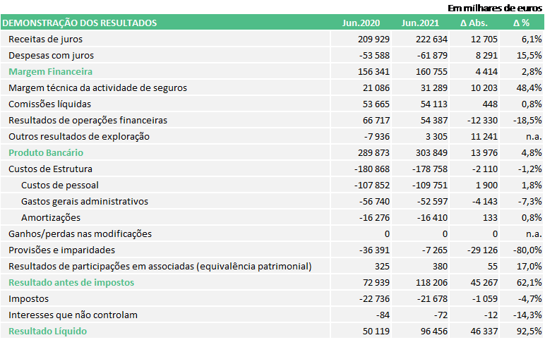 Para a evolução do produto bancário (+14,0 milhões de euros face ao homólogo), contribuiu essencialmente o crescimento da margem financeira em 4,4 milhões de euros (+2,8%), da margem técnica do negócio segurador, que registou uma variação homóloga de +10,2 milhões de euros (+48,4%), e dos outros resultados (+11,2 milhões de euros).