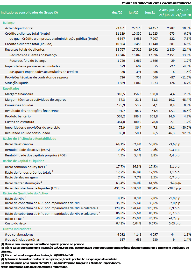 19 de Agosto de 2021 - O Grupo Crédito Agrícola apresenta um resultado líquido consolidado de 96,5 milhões de euros (+92,5% face ao período homólogo) no primeiro semestre de 2021, para o qual o negócio bancário contribuiu com 84,5 milhões de euros (+110,6% face ao 1º semestre de 2020), período marcado por um contexto de incerteza e alguma adversidade para o sector financeiro decorrente ainda do impacto da crise pandémica COVID-19. Indicadores bastante positivos que remetem para os valores pré pandemia, época em que o Grupo Crédito Agrícola apresentou um resultado líquido consolidado de 74,4 milhões de euros (1º semestre de 2019).