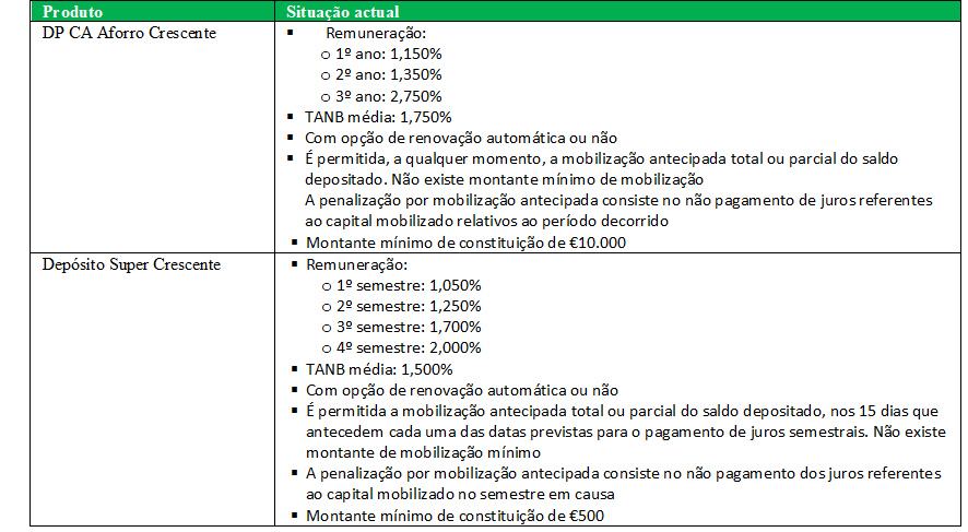 Entre as várias alternativas disponíveis na oferta para os Clientes destaca-se o DP CA Aforro Crescente, que passa a oferecer uma taxa máxima de 2,75% no 3º ano com prémios de permanência com um montante mínimo de constituição de 10 mil euros e sem montante máximo de constituição. A taxa anual nominal bruta foi aumentada para 1,75%. Este é um produto a três anos com taxa de juro crescente.