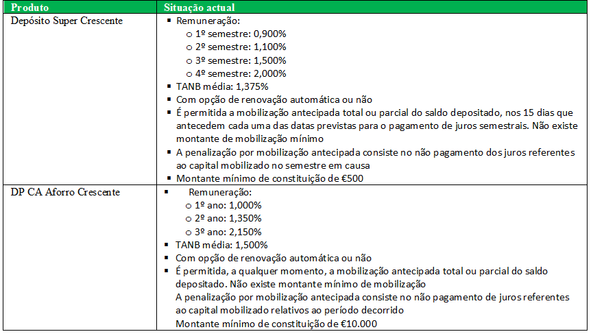 A outra oferta é o DP CA Aforro Crescente, que oferece uma taxa máxima de 2,15% no 3º ano com prémios de permanência com um montante mínimo de constituição de 10 mil euros e sem montante máximo de constituição. É um produto a três anos com taxa de juro crescente.