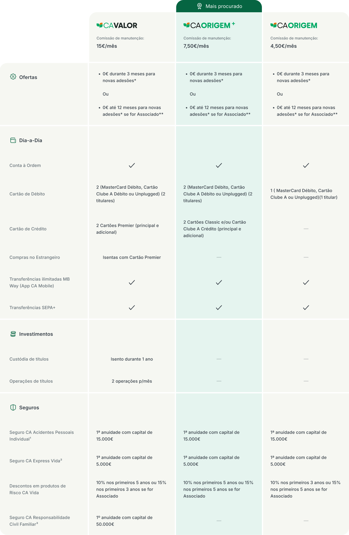 A adesão implica o pagamento de uma Comissão de Manutenção de Conta Pacote mensal de 4,50€ para a Conta Origem, de 7,50€ para a Conta CA Origem + e de 15€ para a Conta CA Valor acrescida de Imposto do Selo à taxa legal, que actualmente é de 4%, que será debitada na respectiva Conta à Ordem. A cobrança da comissão mensal de manutenção da conta pacote é postecipada e efectuada no início de cada mês.